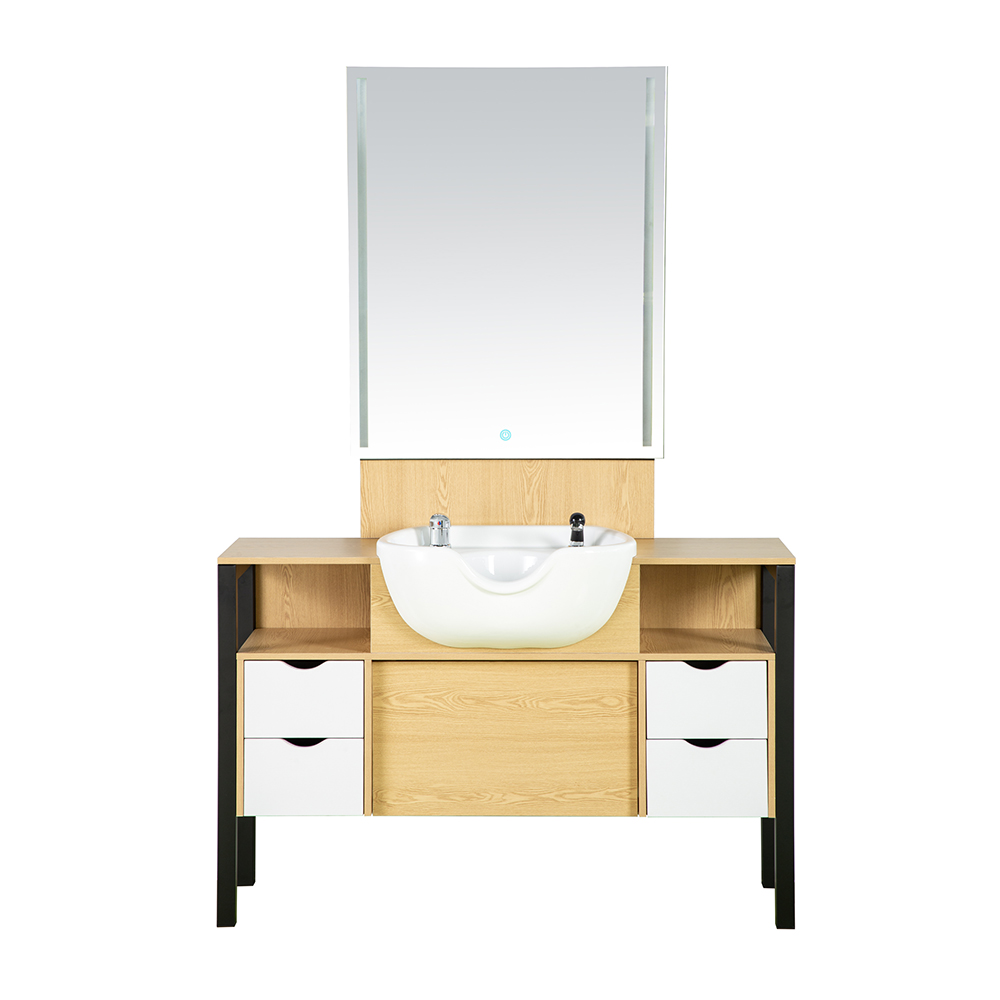 NS:8059 The product design is simple and fashionable, and it is harmonious and beautiful in shape, deeply loved by customers. It is composed of two parts: mirror with Led strip and shampoo basin. The mirror surrounds the soft light strip, which is comfortable but not dazzling. The intelligent touch opens and more clearly. Shampoo basin with uv surface treatment, can anti-pollution and easy to clean. The cabinet around the porcelain basin is designed with simple invisible handle, easy to open and close, and multi-drawer design, making more storage and more convenient to use.